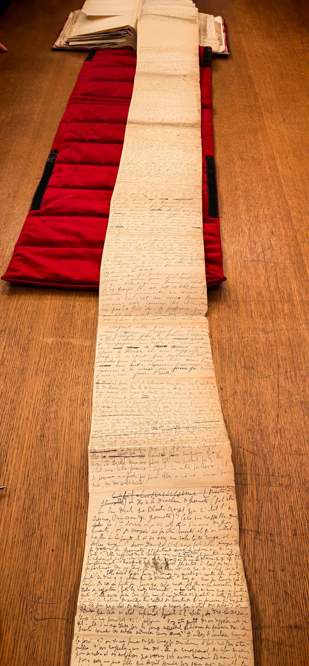 所有人都屏住了呼吸。Guillaume Fau先生把笔记本小心摆放到桌上,一点点地翻开。这是一本B5纸那么大小的笔记本,纸张的色彩已经有些暗淡,发出柔和的黄色光泽。页面上到处都是涂改、删除、添加的痕迹,而且还会不断地粘贴出新的页面。普鲁斯特的思绪旁逸斜出,有时增加出来的内容,已经大大超过原先的框架。于是,粘贴的纸张也随之无限延长。Guillaume Fau先生打开其中一页,一点点地铺陈开来,竟然铺满了整个桌面。眼前的这幅不断地往前延伸的手稿,略有些斑驳,然而字迹无比清晰,这让我不由得想起法朗士的那句名言:“人生太短,普鲁斯特太长。”《追忆》不只是有着240万字的超长篇幅,还有着一个又一个长句,最长的一句竟有着850多个单词。而面前的这张纸,正是对普鲁斯特文风的最好注脚。